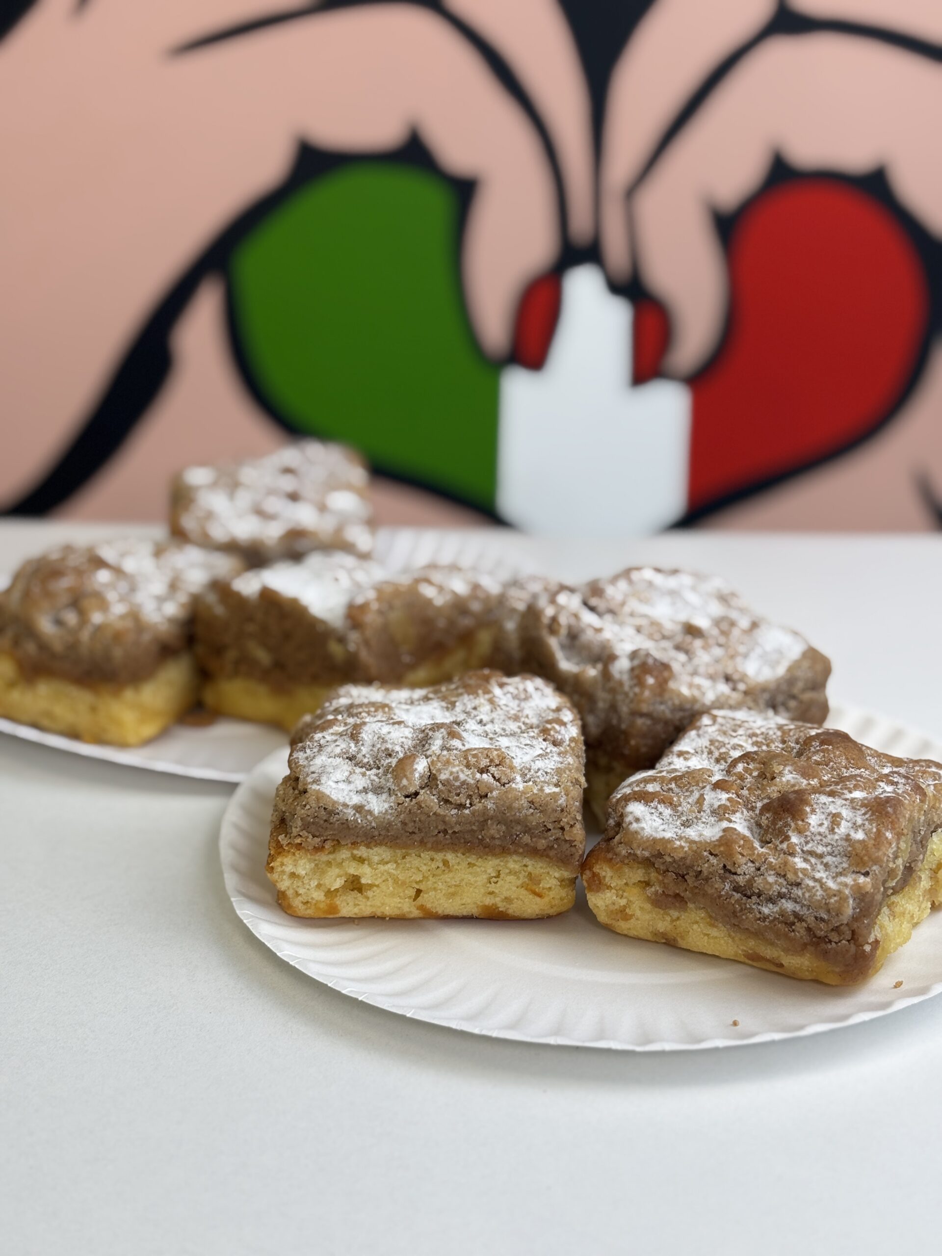 Moist cake topped with a thick layer of buttery cinnamon crumbs.